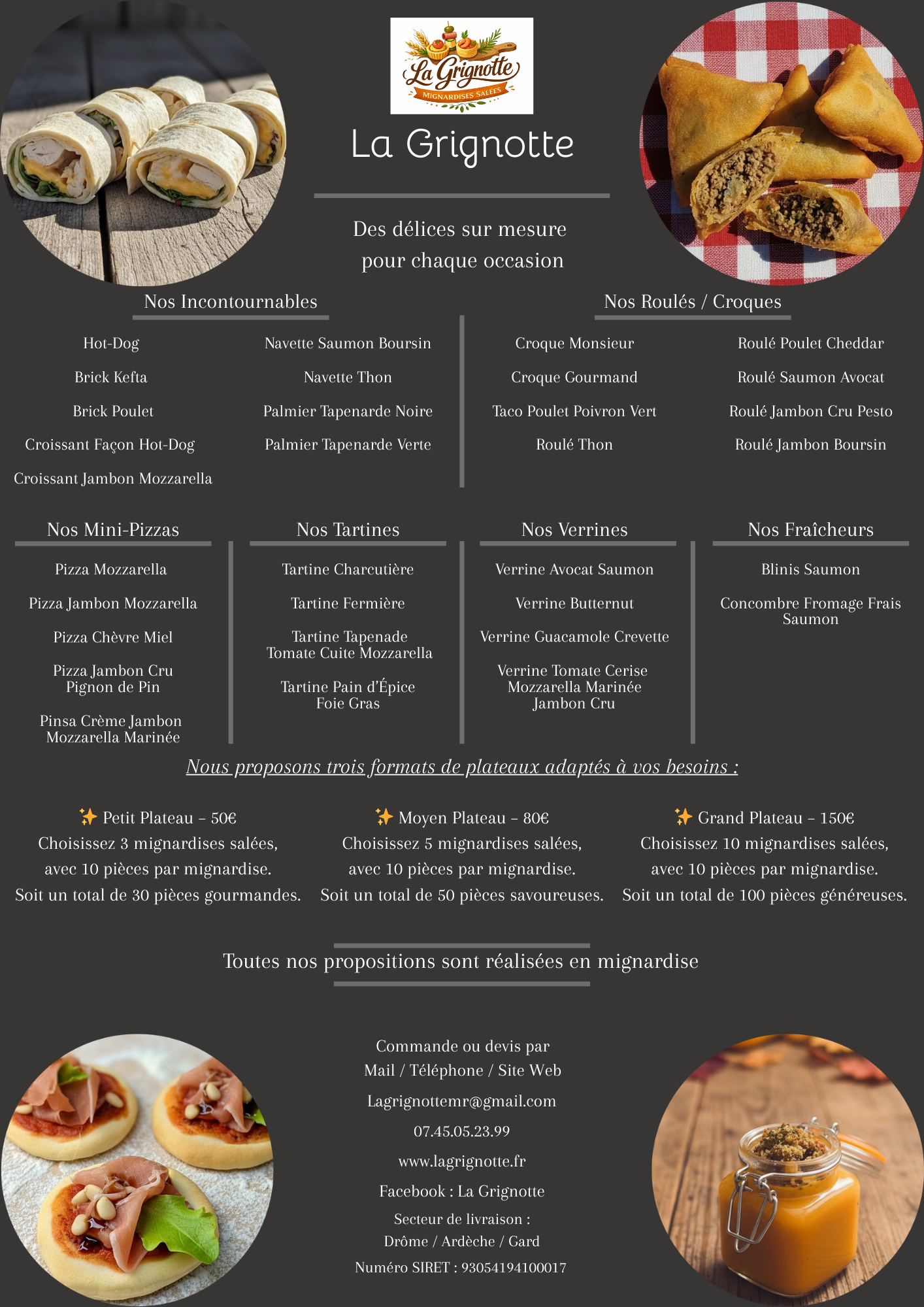Bienvenue chez La Grignotte, votre prestataire en ligne dédié aux mignardises salées et verrines d'exception. Nous mettons un point d'honneur à créer des mets raffinés pour tous vos événements, du simple apéritif aux grandes réceptions.