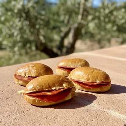 Une navette moelleuse et légèrement dorée, garnie de chorizo savoureux aux notes épicées et parfumées. Sa texture tendre contraste parfaitement avec le caractère du chorizo, offrant une bouchée généreuse et pleine de goût.
