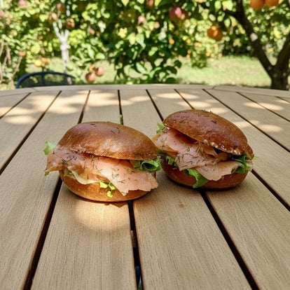 Une navette moelleuse et délicatement dorée, garnie de fines tranches de magret de canard fumé aux arômes subtils et légèrement boisés. Sa texture tendre s’accorde parfaitement avec le caractère du canard fumé, offrant une bouchée élégante et pleine de saveurs.
