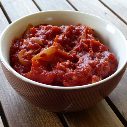 Une verrine ensoleillée aux saveurs méditerranéennes, composée d’une préparation de légumes mijotés à la tomate façon frita, délicatement assaisonnée. On y retrouve une texture fondante et généreuse, relevée par des notes légèrement confites et parfumées.